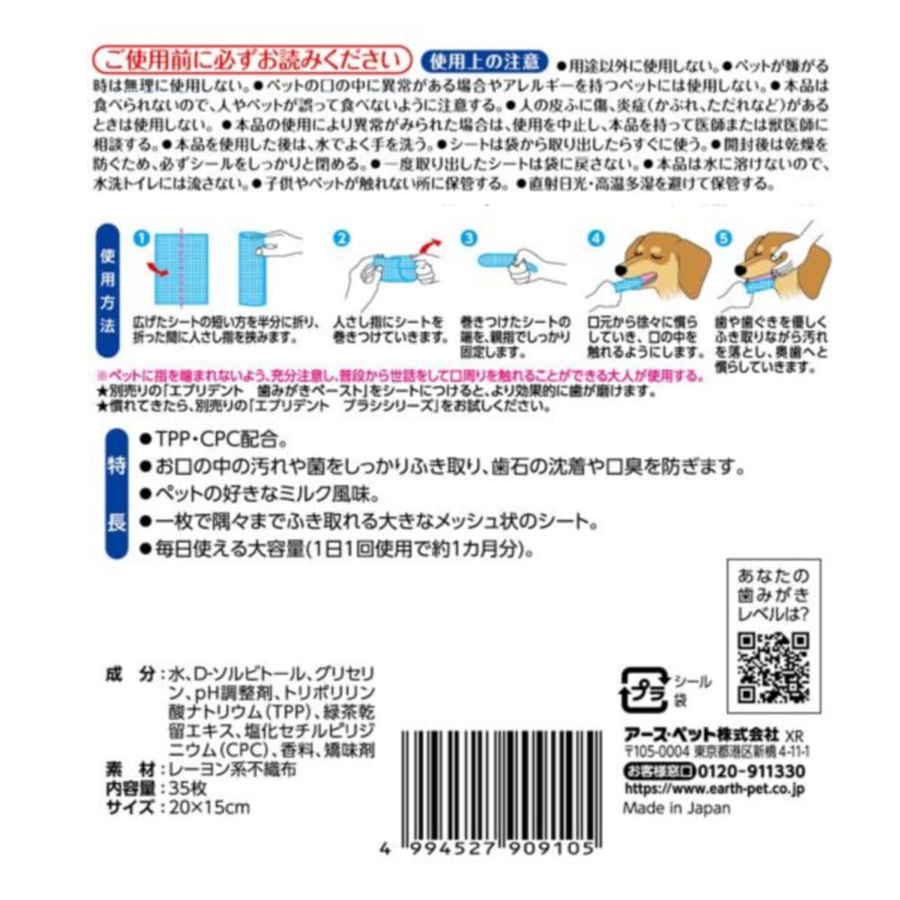 お取り扱い上の注意:●歯や歯茎をやさしく拭き取りながら汚れを落とし、奥歯へと慣らしていきます。●用途以外に使用しない。ペットが嫌がる時には無理に使用しない。●ペットの口の中に異常がある場合やアレルギーをもつペットには使用しない。●本品は食べられないので人やペットが食べないように注意する。●本品は水には溶けないので水洗トイレには流さない。開封後は乾燥を防ぐために必ずチャックを閉める。●小児やペットが触れない場所で使用すること。