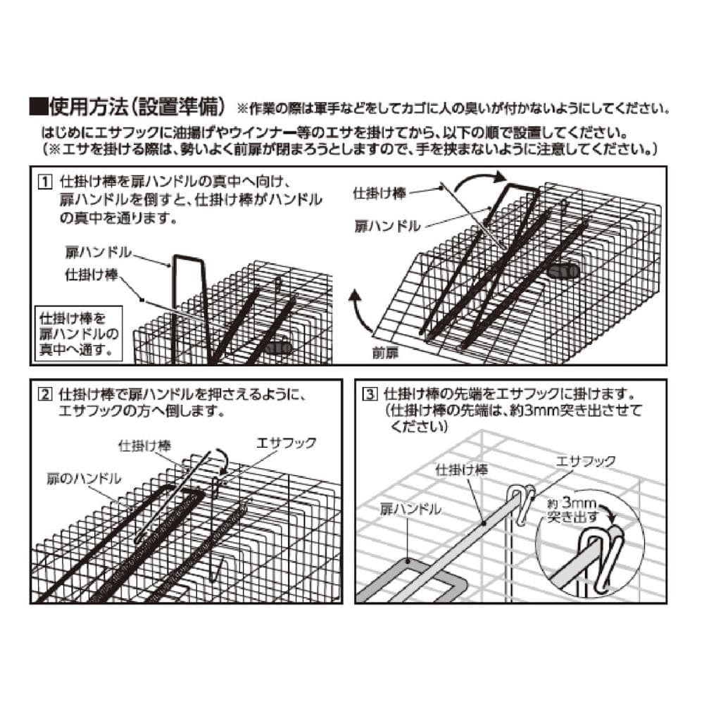 【使用上の注意点】 ・本品を動物へのイタズラ、虐待の目的には絶対に使用しないでください。 ・小さなお子様の部屋や、ペットの手の届く所には危険ですので設置・保管をしないでください。 ・本品は水中での設置はできません。 ・設置場所によっては公共施設等周辺等、設置できないこともありますのでご注意ください。 ・使用後は洗剤等でよく洗い、水気を取ってから保管してください。|・包装資材は、お住まいの地域の自治体のルールに従って廃棄してください。