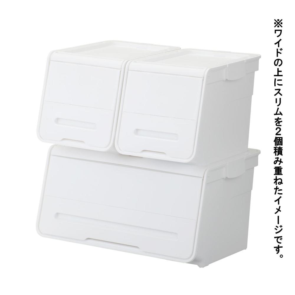 積み重ねは3段まで可能(1段あたりの耐荷重は4kg)同サイズの積み重ねはもちろん、ワイド1つにスリム2つを並べて積むことができ、収納する物に合わせて組み合わせを選ぶことができます。