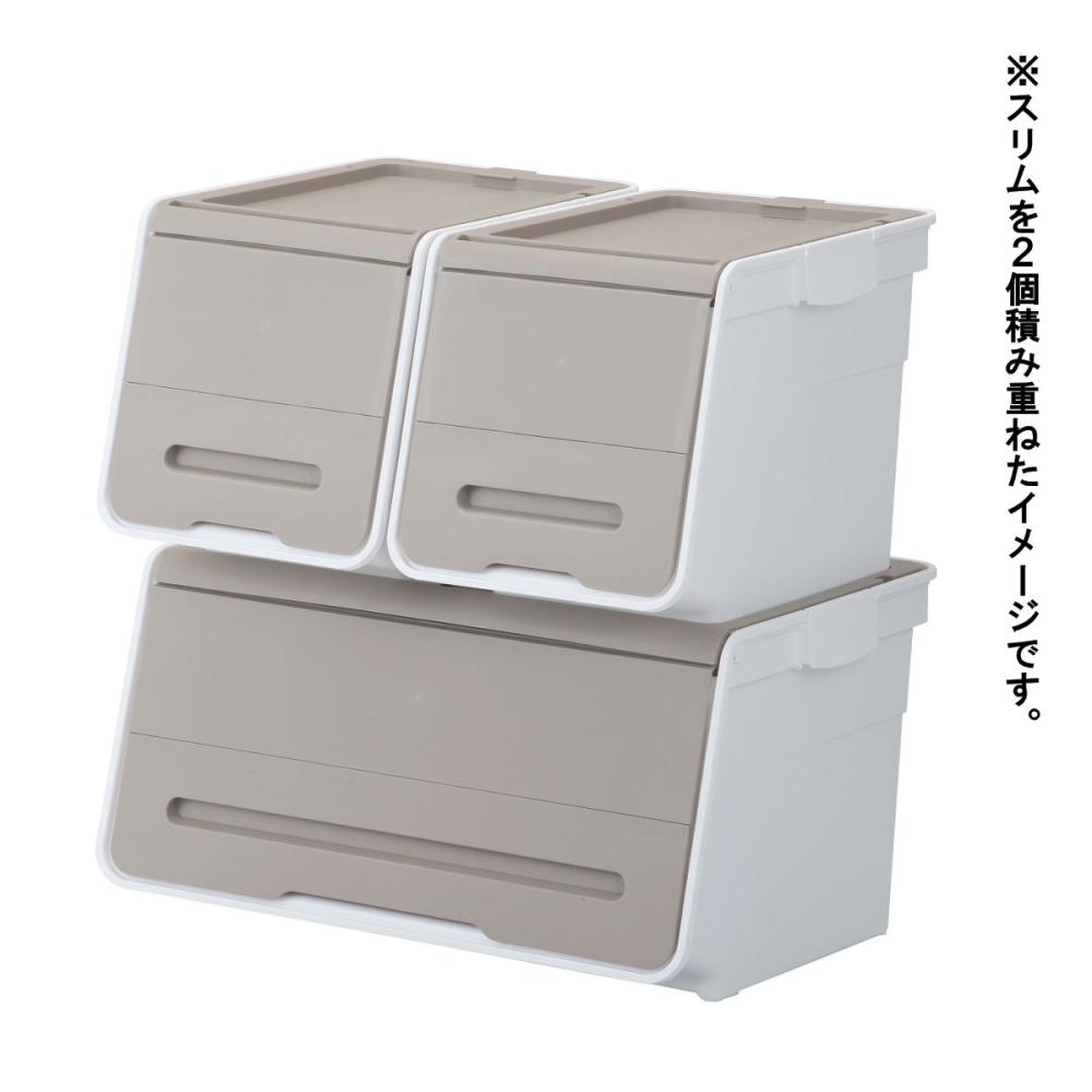 積み重ねは3段まで可能(1段あたりの耐荷重は4kg)同サイズの積み重ねはもちろん、ワイド1つにスリム2つを並べて積むことができ、収納する物に合わせて組み合わせを選ぶことができます。