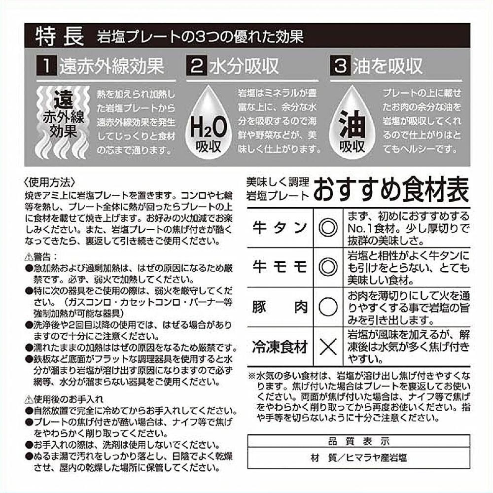 【特徴】 岩塩はミネラルを豊富に含有していておいしく焼きあがります。 【岩塩プレートの3つの優れた効果】 1、遠赤外線効果 熱を加えられ加熱した岩塩プレートから遠赤外線効果を発生してじっくりと食材の芯まで通ります。 2、水分吸収 岩塩はミネラルが豊富な上に、余分な水分を吸収するので海鮮や野菜などが、美味しく仕上がります。 3、油を吸収 プレートの上に載せたお肉の余分な油を岩塩が吸収してくれるので仕上がりはとてもヘルシーです。 【仕様】 材質:ヒマラヤ産岩塩 原産国:パキスタン
