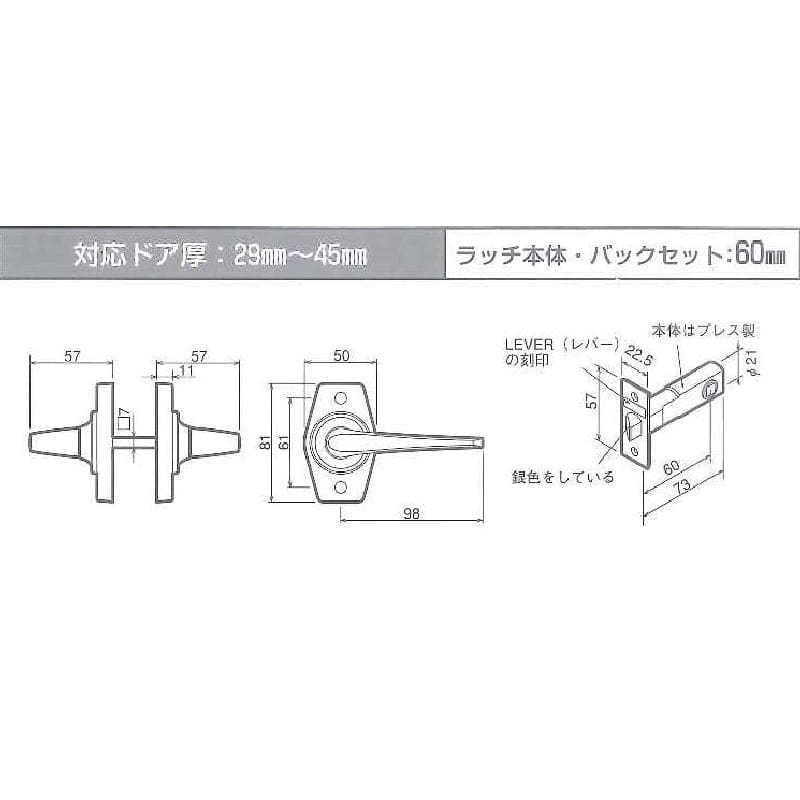対応ドア厚29mm~45mm。バックセット60mm。取付ビスピッチ61mm。