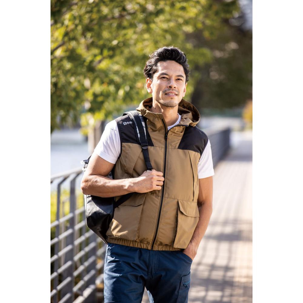 フード仕様。フードアジャスター付き。背中風気路で風の通りが良い。裾ずり上がり防止ループ付き。