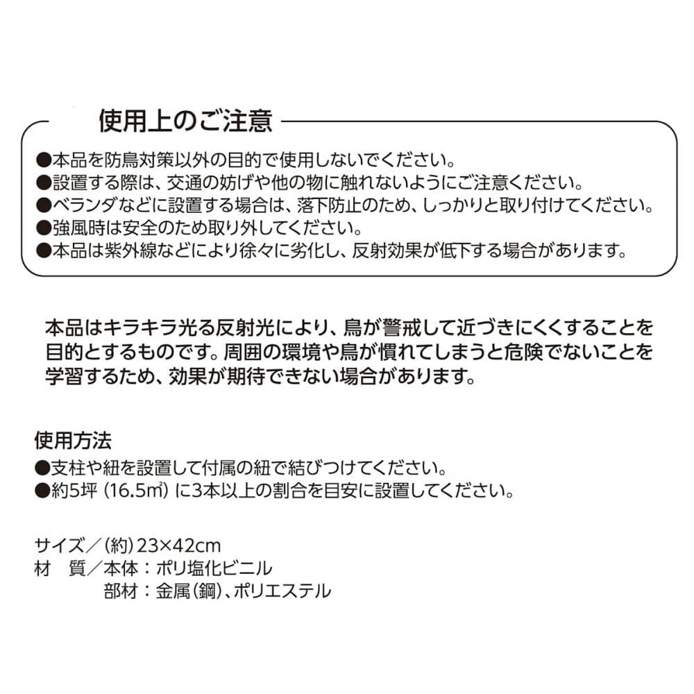 【使用上のご注意】 ・本品を防鳥対策以外の目的で使用しないでください。 設置する際は、交通の妨げや他の物に触れないようにご注意ください。 ・ベランダなどに設置する場合は、落下防止のため、しっかりと取り付けてください。 ・強風時は安全のため取り外してください。 ・本品は紫外線などにより徐々に劣化し、反射効果が低下する場合があります。 ・本品はキラキラ光る反射光により、鳥が警戒して近づきにくくすることを 目的とするものです。周囲の環境や鳥が慣れてしまうと危険でないことを 学習するため、効果が期待できない場合があります。