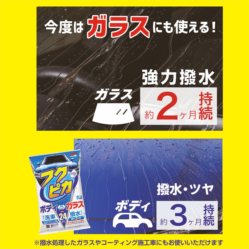 ボディとガラスの両方に使用でき、拭くだけで汚れ落としと同時に強力な水ハジキ効果を発揮する、水なし洗車「フクピカ」の第5世代モデル。
