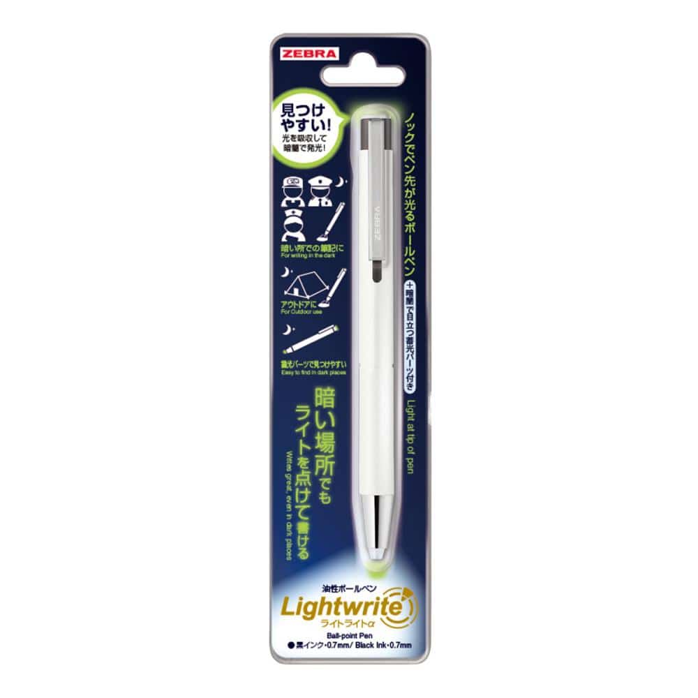 暗い場所でもライトを点けて書ける。ノックでペン先が光るボールペン。
