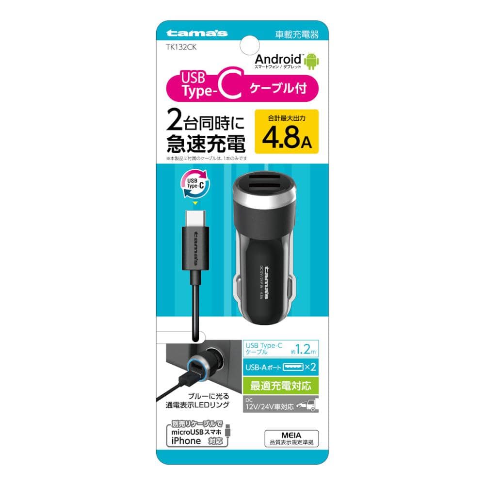 2ポート合計最大4.8A(1ポート最大2.4A)の高出力で2台同時に急速充電が可能。