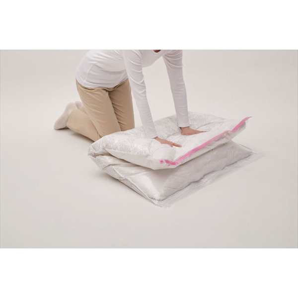 バツグンの空気抜けの良さで、スタートから無理なくスピード圧縮。 両面スライダー付きが新しい! 空気戻りをしっかり防ぎ、圧縮キープ。 約10cm厚のやわらか圧縮で、布団にストレスもかからない。 人気のレース柄に、片面は透明タイプで中身の確認もできます。