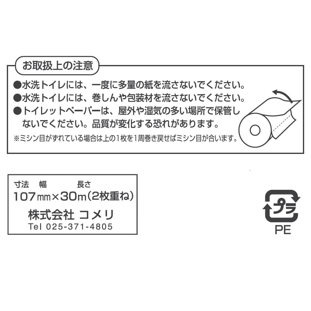 【製品寸法】(約)幅107mm×長さ30m(2枚重ね) 【材質】再生紙 【お取り扱上の注意】 ●水洗トイレには、一度に大量の紙を流さないでください。 ●水洗トイレには、巻き芯や包装材を流さないでください。 ●トイレットペーパーは、屋外や湿気の多い場所で保管しないでください。品質が変化する恐れがあります。