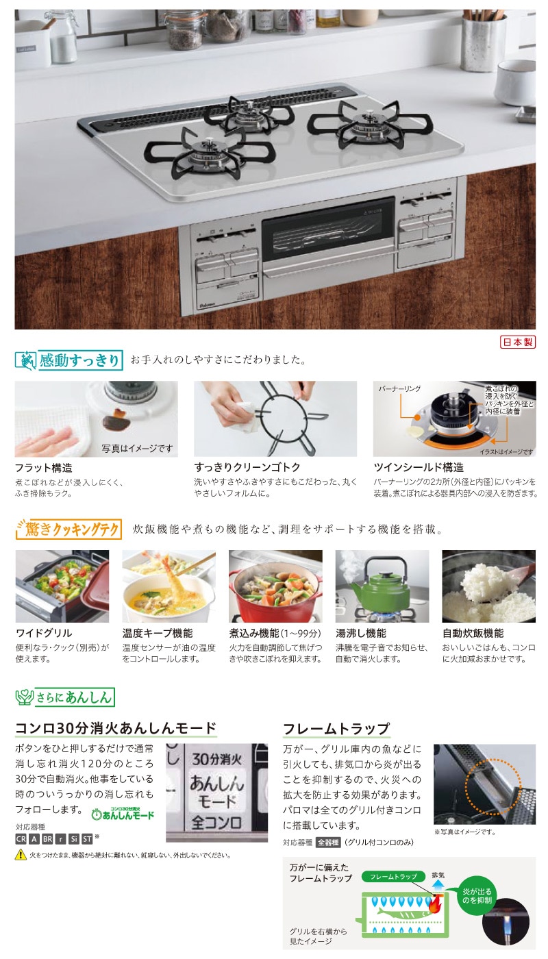 立消え安全装置/調理油加熱防止装置/消し忘れ消火機能/焦げつき消火機能/異常加熱防止装置/フレームトラップ