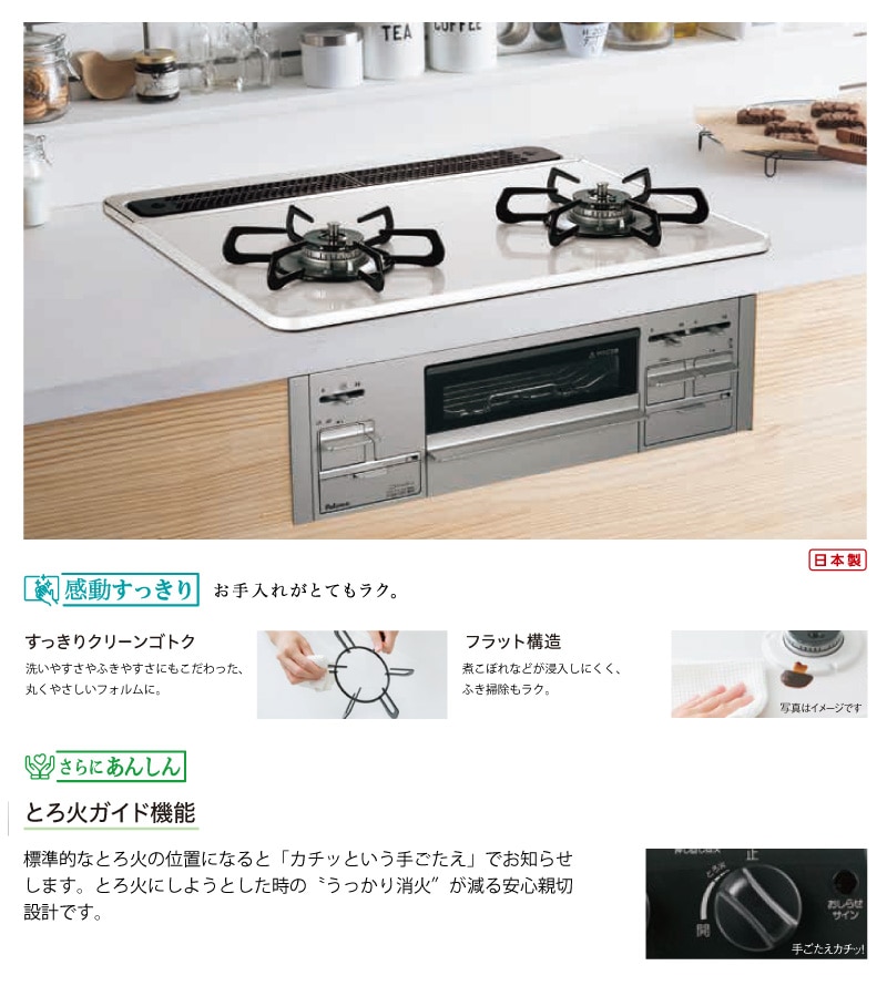 立消え安全装置/調理油加熱防止装置/消し忘れ消火機能/焦げつき消火機能/異常加熱防止装置/フレームトラップ/低荷重温度センサー