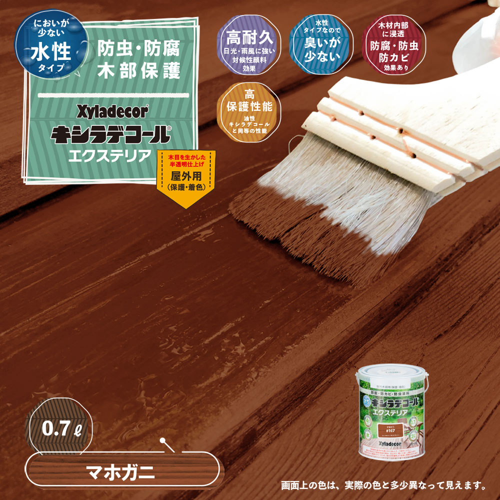 ◆防虫の対象はヒラタキクイムシなどの木材害虫です。 ◆屋外木部に。(ウッドデッキ、ラティス、パーゴラ、ベンチ、ログハウス、ガーデンテーブル、窓枠、板へい) 【塗れない材質】 吸い込みのない木材(プリント合板・デコラ板など化粧板)、常に水に浸かる所 食品と接触する所、または食器が置かれる所、木製の鳥籠や犬小屋、温室の内部の木材 ■ 仕 様 ■ 色:マホガ二 容量:0.7L 重量(約):850g 塗り面積(約):2.8〜4.2m2 (2回塗り) 乾燥時間(約):24時間(20℃)、3日以上(低温・多湿時) 塗り重ね間隔(約):4時間以上(20℃)