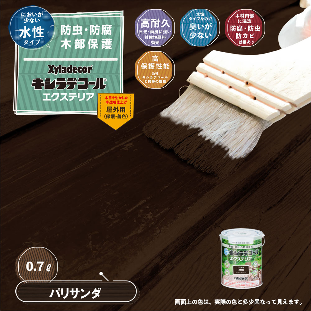 ◆防虫の対象はヒラタキクイムシなどの木材害虫です。 ◆屋外木部に。(ウッドデッキ、ラティス、パーゴラ、ベンチ、ログハウス、ガーデンテーブル、窓枠、板へい) 【塗れない材質】 吸い込みのない木材(プリント合板・デコラ板など化粧板)、常に水に浸かる所 食品と接触する所、または食器が置かれる所、木製の鳥籠や犬小屋、温室の内部の木材 ■ 仕 様 ■ 色:パリサンダ 容量:0.7L 重量(約):850g 塗り面積(約):2.8〜4.2m2 (2回塗り) 乾燥時間(約):24時間(20℃)、3日以上(低温・多湿時) 塗り重ね間隔(約):4時間以上(20℃)