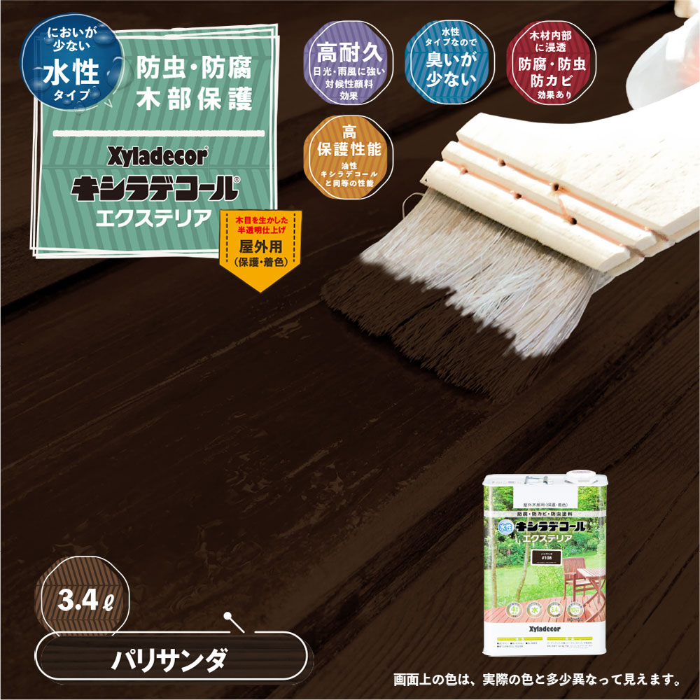 ◆防虫の対象はヒラタキクイムシなどの木材害虫です。 ◆屋外木部に。(ウッドデッキ、ラティス、パーゴラ、ベンチ、ログハウス、ガーデンテーブル、窓枠、板へい) 【塗れない材質】 吸い込みのない木材(プリント合板・デコラ板など化粧板)、常に水に浸かる所 食品と接触する所、または食器が置かれる所、木製の鳥籠や犬小屋、温室の内部の木材 ■ 仕 様 ■ 色:パリサンダ 容量:3.4L 重量(約):4080g 塗り面積(約):13.6〜20.4m2 (2回塗り) 乾燥時間(約):24時間(20℃)、3日以上(低温・多湿時) 塗り重ね間隔(約):4時間以上(20℃)