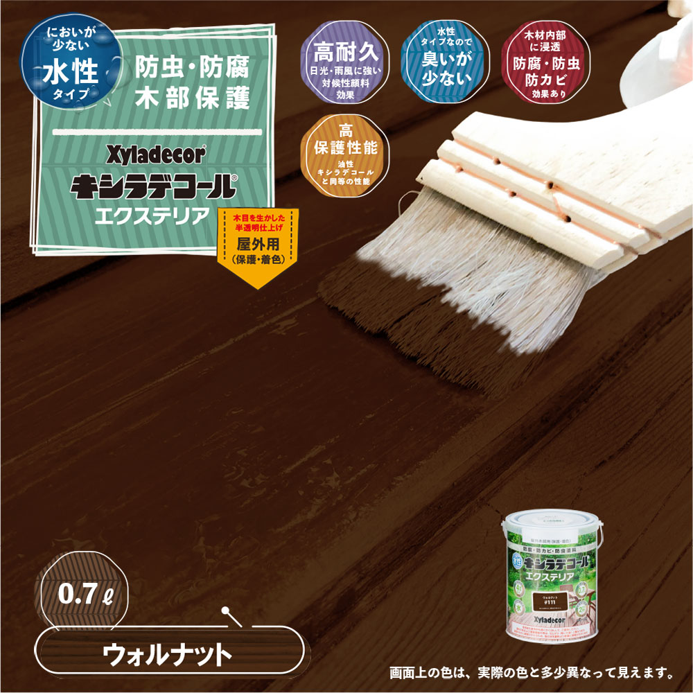 ◆防虫の対象はヒラタキクイムシなどの木材害虫です。 ◆屋外木部に。(ウッドデッキ、ラティス、パーゴラ、ベンチ、ログハウス、ガーデンテーブル、窓枠、板へい) 【塗れない材質】 吸い込みのない木材(プリント合板・デコラ板など化粧板)、常に水に浸かる所 食品と接触する所、または食器が置かれる所、木製の鳥籠や犬小屋、温室の内部の木材 ■ 仕 様 ■ 色:ウォルナット 容量:0.7L 重量(約):850g 塗り面積(約):2.8〜4.2m2 (2回塗り) 乾燥時間(約):24時間(20℃)、3日以上(低温・多湿時) 塗り重ね間隔(約):4時間以上(20℃)
