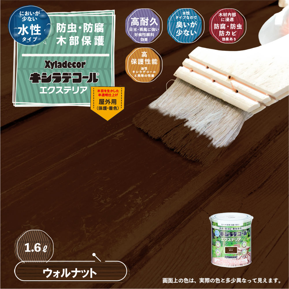 ◆防虫の対象はヒラタキクイムシなどの木材害虫です。 ◆屋外木部に。(ウッドデッキ、ラティス、パーゴラ、ベンチ、ログハウス、ガーデンテーブル、窓枠、板へい) 【塗れない材質】 吸い込みのない木材(プリント合板・デコラ板など化粧板)、常に水に浸かる所 食品と接触する所、または食器が置かれる所、木製の鳥籠や犬小屋、温室の内部の木材 ■ 仕 様 ■ 色:ウォルナット 容量:1.6L 重量(約):1880g 塗り面積(約):6.4〜9.6m2 (2回塗り) 乾燥時間(約):24時間(20℃)、3日以上(低温・多湿時) 塗り重ね間隔(約):4時間以上(20℃)