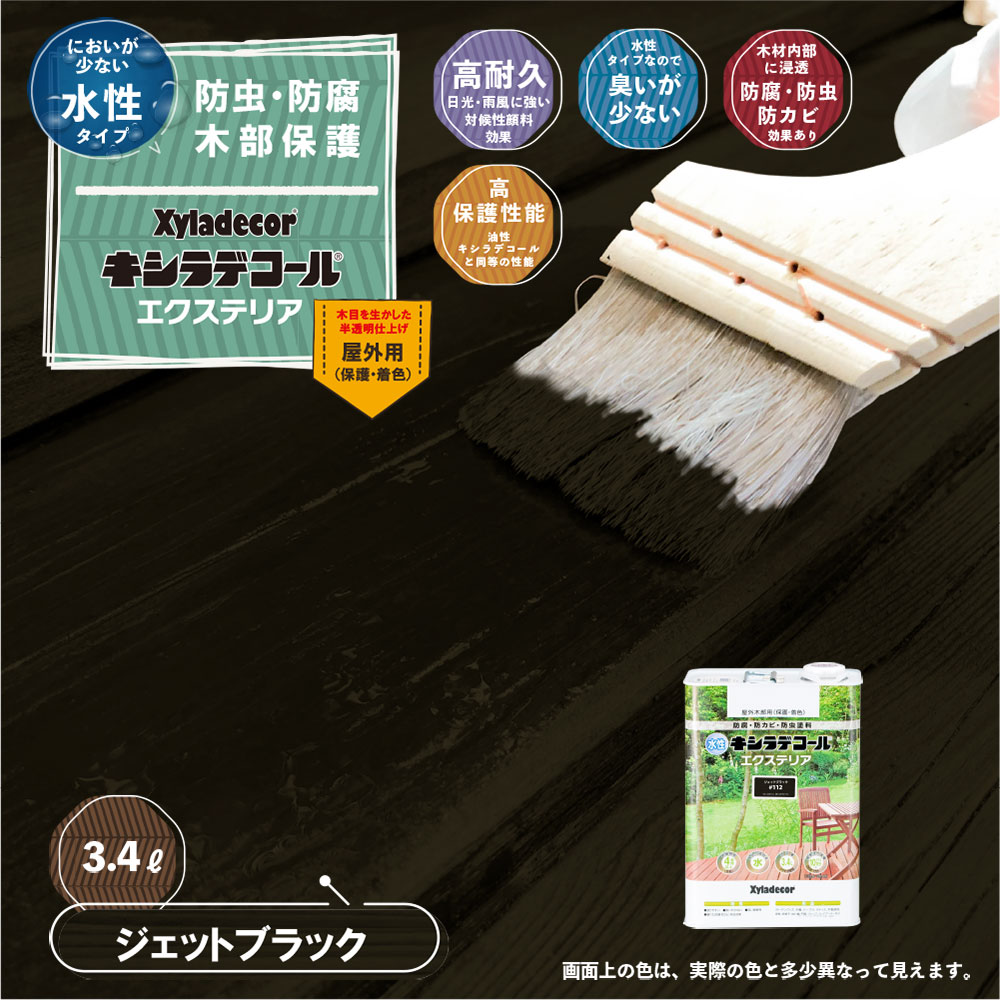 ◆防虫の対象はヒラタキクイムシなどの木材害虫です。 ◆屋外木部に。(ウッドデッキ、ラティス、パーゴラ、ベンチ、ログハウス、ガーデンテーブル、窓枠、板へい) 【塗れない材質】 吸い込みのない木材(プリント合板・デコラ板など化粧板)、常に水に浸かる所 食品と接触する所、または食器が置かれる所、木製の鳥籠や犬小屋、温室の内部の木材 ■ 仕 様 ■ 色:ジェットブラック 容量:3.4L 重量(約):4080g 塗り面積(約):13.6〜20.4m2 (2回塗り) 乾燥時間(約):24時間(20℃)、3日以上(低温・多湿時) 塗り重ね間隔(約):4時間以上(20℃)