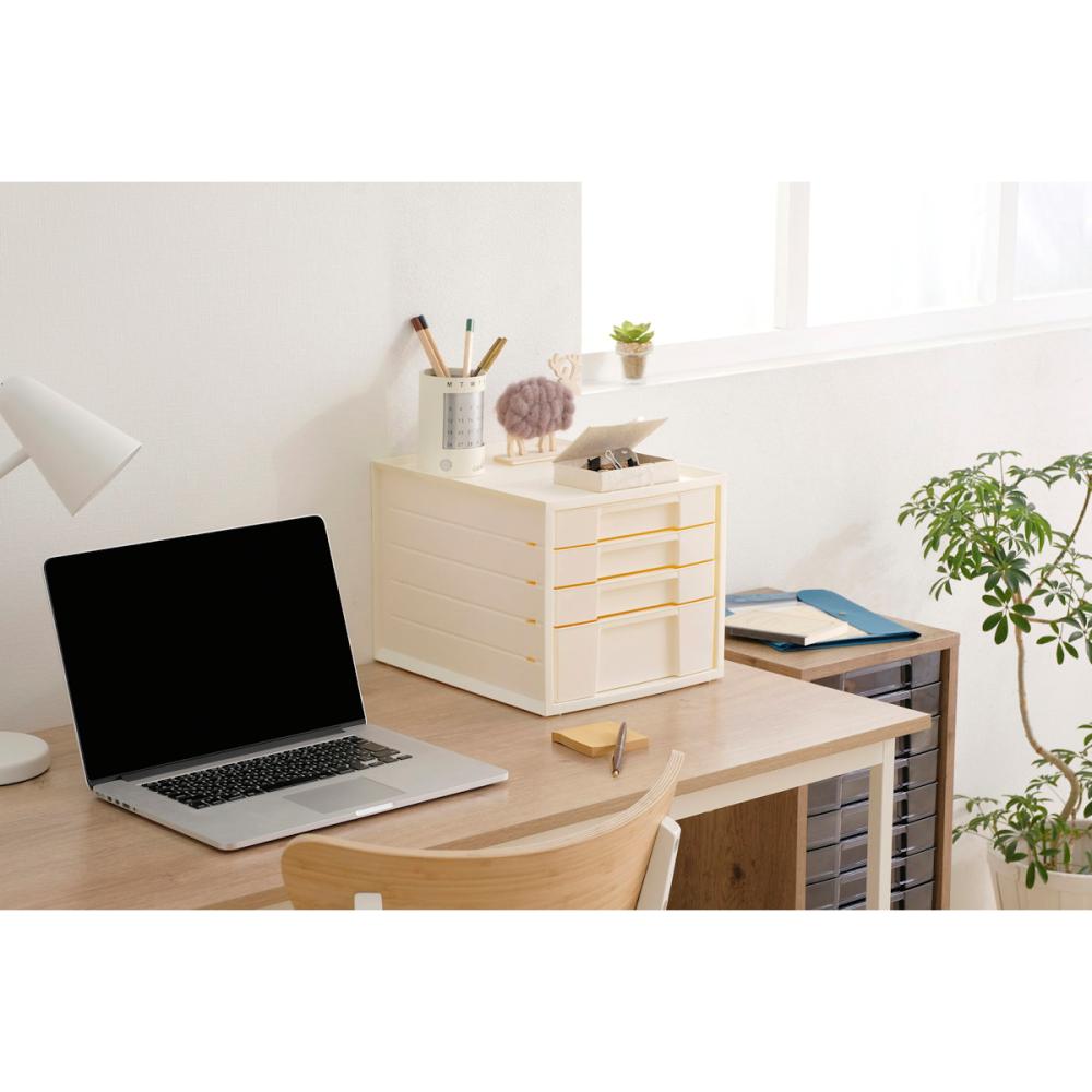 引き出しは浅型3段と深型1段の組み合わせです。 引き出しストッパー付きです。 天板はA4サイズのクリアファイル(約310×220mm)が収納でき、書類やペン類が落ちにくい段差形状です。 分類に便利なインデックスラベルと滑り止め用のゴム脚付きです。