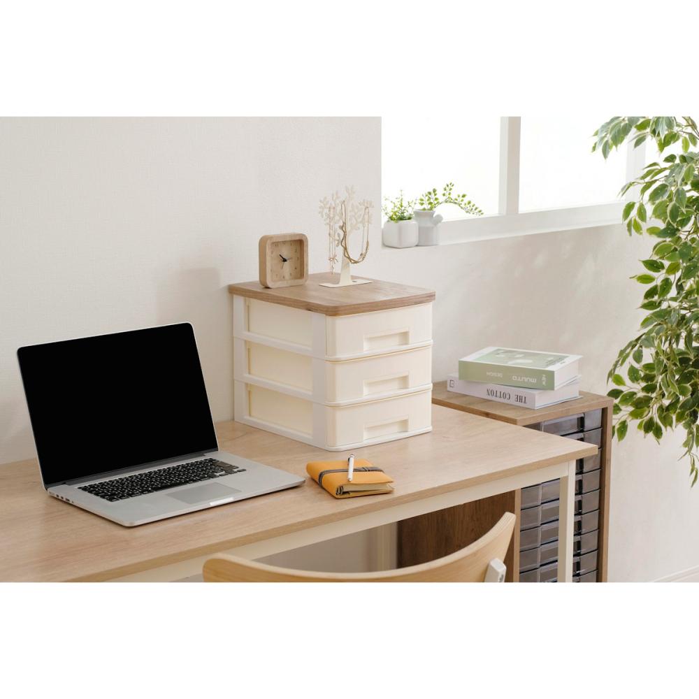 ●素材:本体:ポリプロピレン、天板:プリント紙化粧繊維板、引き出し:ポリプロピレン ●引出内寸(約):217×298×70mm ●収納物の目安:A4サイズまでの書類、小物など