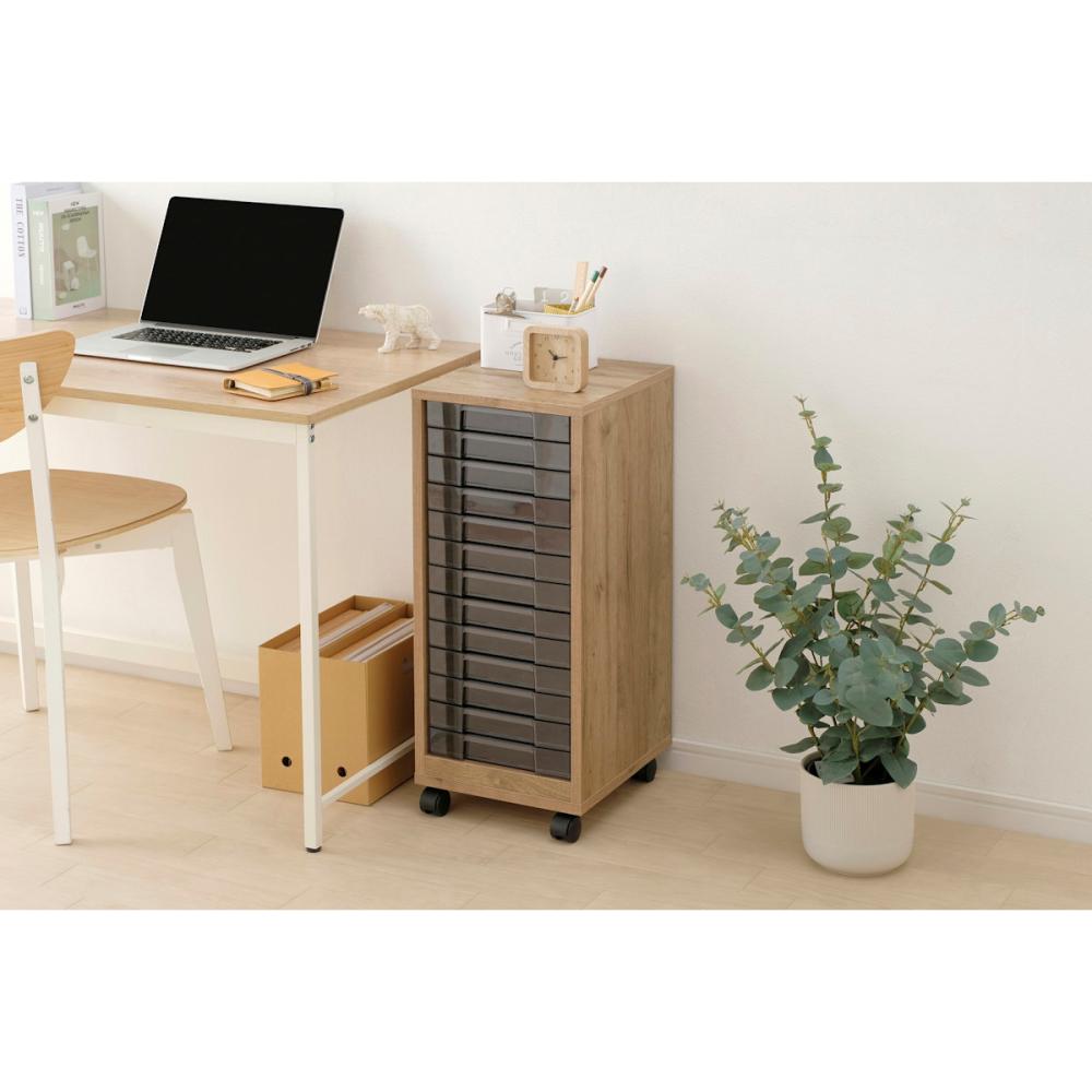 デスク横での使用に最適な高さの浅型13段タイプです。 キャスターが付いているので移動にとても便利です。