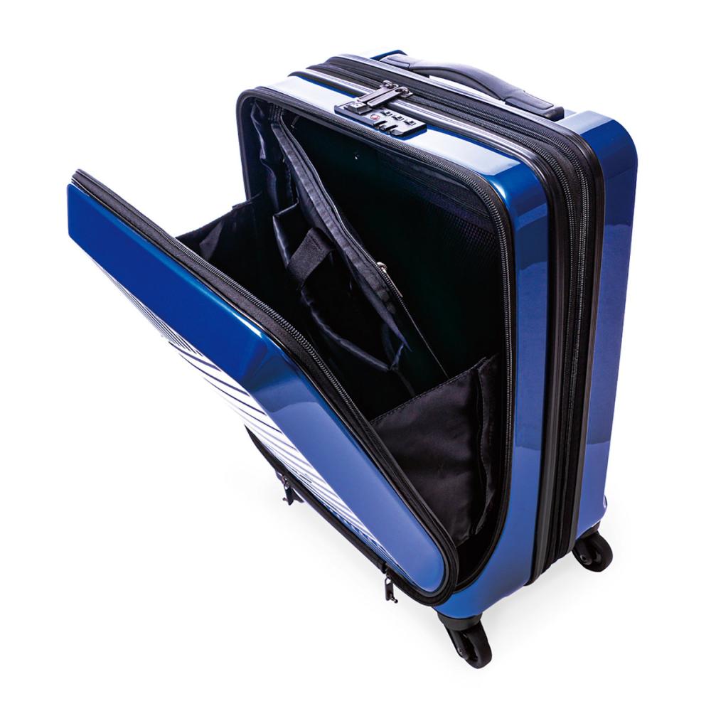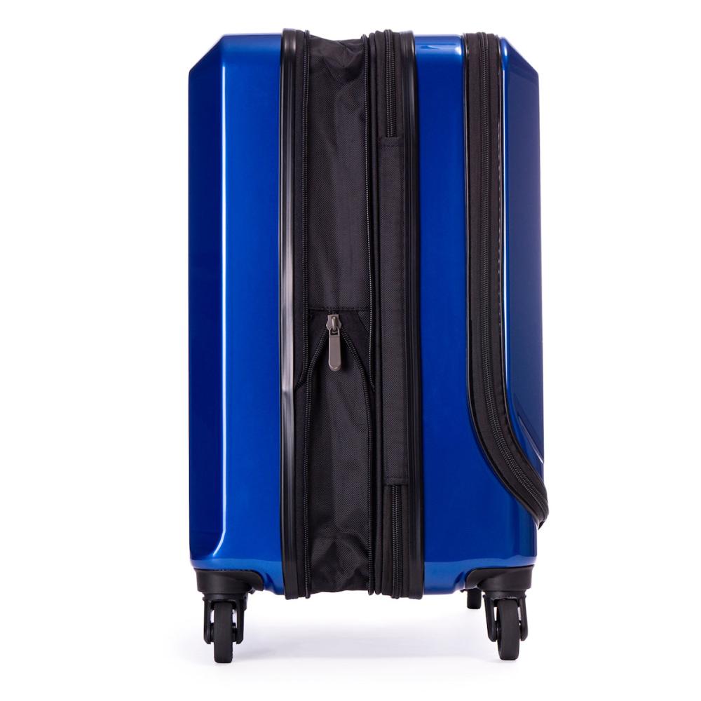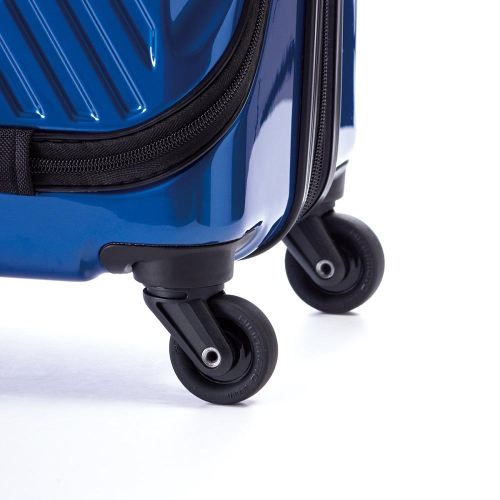 ・フロントオープン フロントルームはメッシュポケットとPC収納も可能なポケット付き。 メインルームにアクセスできるので荷物も簡単に取り出せます。 ・メインルーム メインルームはメッシュポケット3にディバイダー(仕切り)と クロスベルト付きなので荷物の整理が楽々です。 ・拡張機能 4.5cm拡張しファスナーで簡単に拡張出来るので、 出先や旅先で急に荷物が増えても安心な便利機能。 ・静音キャスター HINOMOTOキャスター採用。 軽やでスムーズな走行と静音を実現しました。