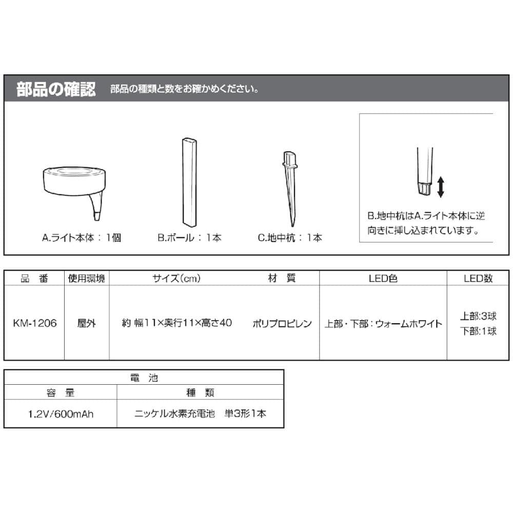 ・使用環境:屋外 ・材質:ポリプロプレン ・LED色:ウォームホワイト ・電池:1.2V/600mAh ニッケル水素充電池 単3形1本(※) ※付属されている充電池は工場出荷時における点灯確認用のものです。 長くお使いいただくために、別売りの単3形 1.2V 600mAh以上の充電池をご購入ください。
