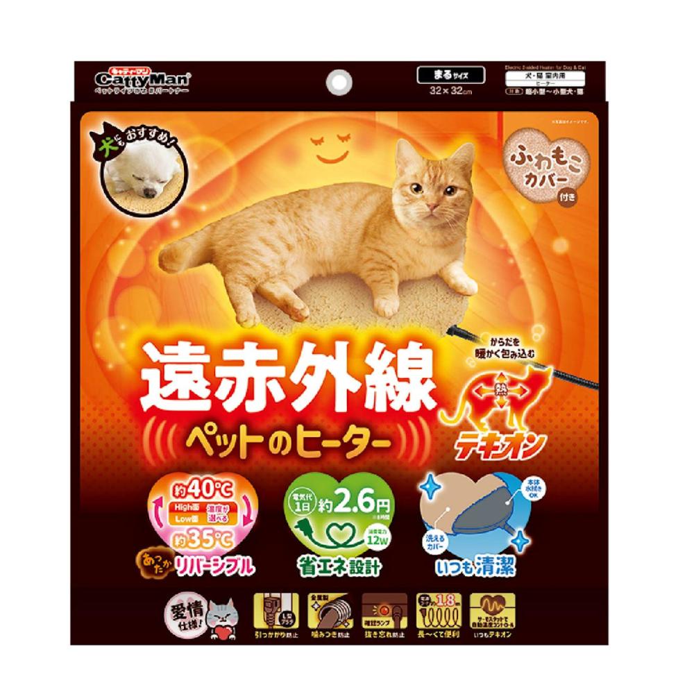 お取り扱い上の注意:●ペットに適した温度設定のため、人間用のような温感はありません。●次のような行為は絶対にしないでください。商品が異常過熱して火災や故障の原因になります。〇ホットカーペット、床暖房など、他の暖房器具との併用。〇お客様ご自身での分解、修理、改造。〇上に毛布など保温性のよい物を置く。〇専用カバー以外の使用。〇ペットに噛ませる。〇外出するとき、使用していないとき、本品を移動するとき、手入れするときは、必ず電源プラグをコンセントから抜いてください。