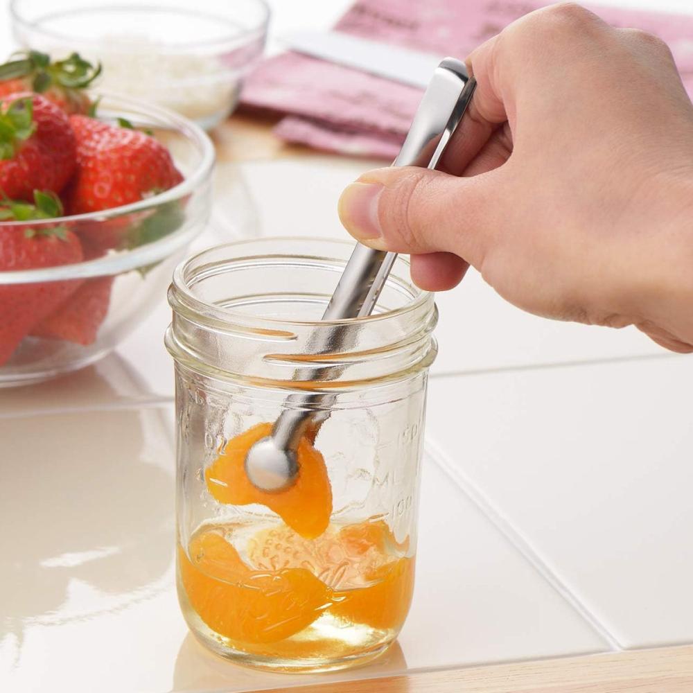 スリムで長身なので小瓶にもスッと入り、先端のギザ刃で食材をしっかりつかめる