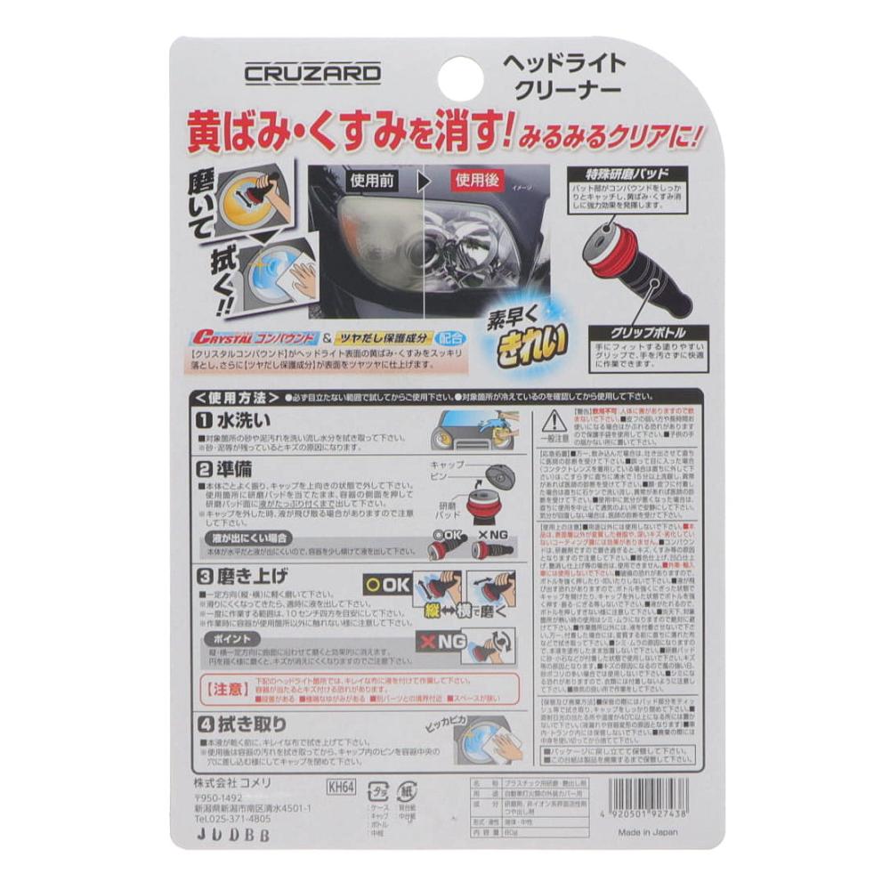 クリスタルコンパウンドがヘッドライト表面の黄ばみ、くすみをすっきり落とし、さらにツヤだし保護成分が表面をツヤツヤに仕上げます。