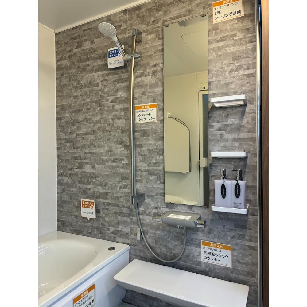 快適性:人間工学を適用した「ゆるリラ浴槽」で身も心もリラックス。従来の浴槽より関節にかかる力を分散し、入る人をやさしく包み込み支えます。またシャワーバー(手すり兼用)は立っても座ってもぴったりの位置に固定できます。シャワー自体の角度調整も可能です。