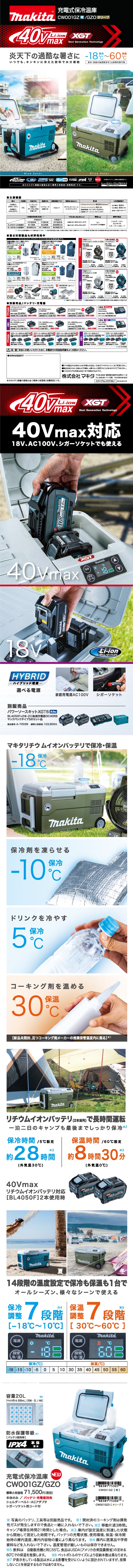 "容量20L。 【冷却能力】90W(-18℃) 【加熱能力】42W(60℃)。 40Vmax・プロ用18Vバッテリ・家庭用電源AC100V・シガーソケット対応。 *バッテリ別売のためバッテリでのご使用の場合は対応バッテリ・充電器が必要です。 標準付属品:ショルダーベルト・ACアダプタ・シガーソケット用コード"