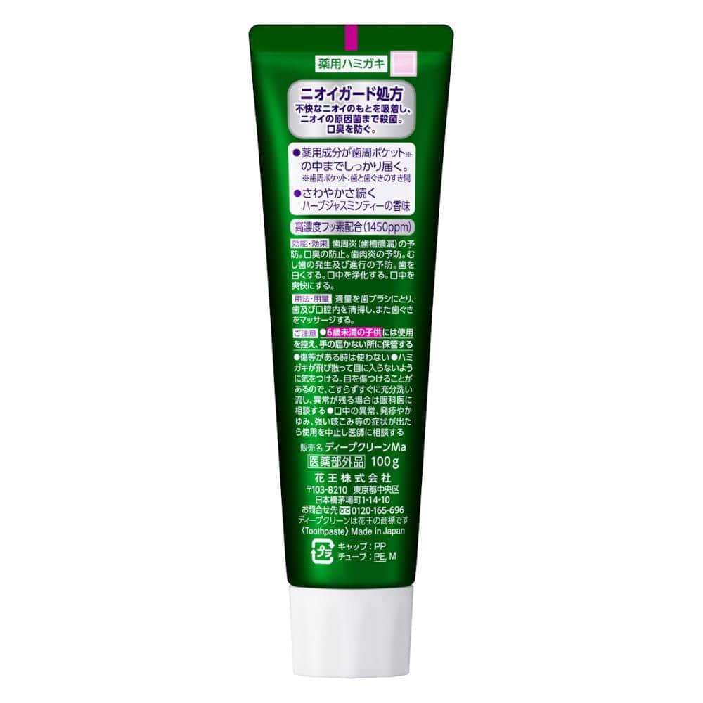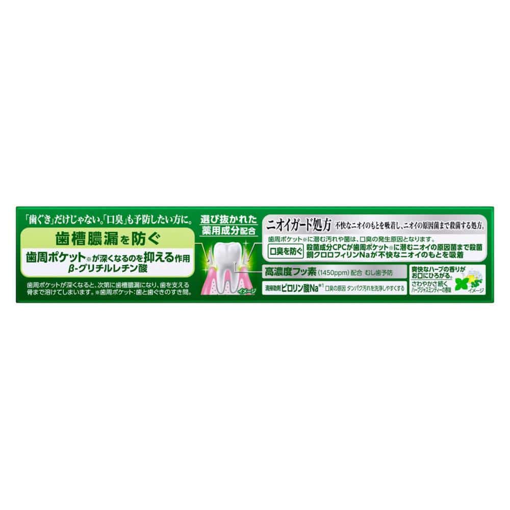 薬用成分(抗炎症・殺菌・歯質強化)に加え、選び抜かれた口臭予防成分配合。 抗炎症成分(B-グリチルレチン酸)が、歯周ポケット※の中までしっかり届き、歯周ポケット※が深くなるのを抑制して、歯槽膿漏予防。 殺菌成分(塩化セチルピリジニウム)が歯周ポケット※に潜むニオイの原因菌まで殺菌、銅クロロフィリンNaが不快なニオイのもとを吸着、口臭予防。 ハーブジャスミンティーの香味。 ※歯と歯ぐきのすき間(医薬部外品)