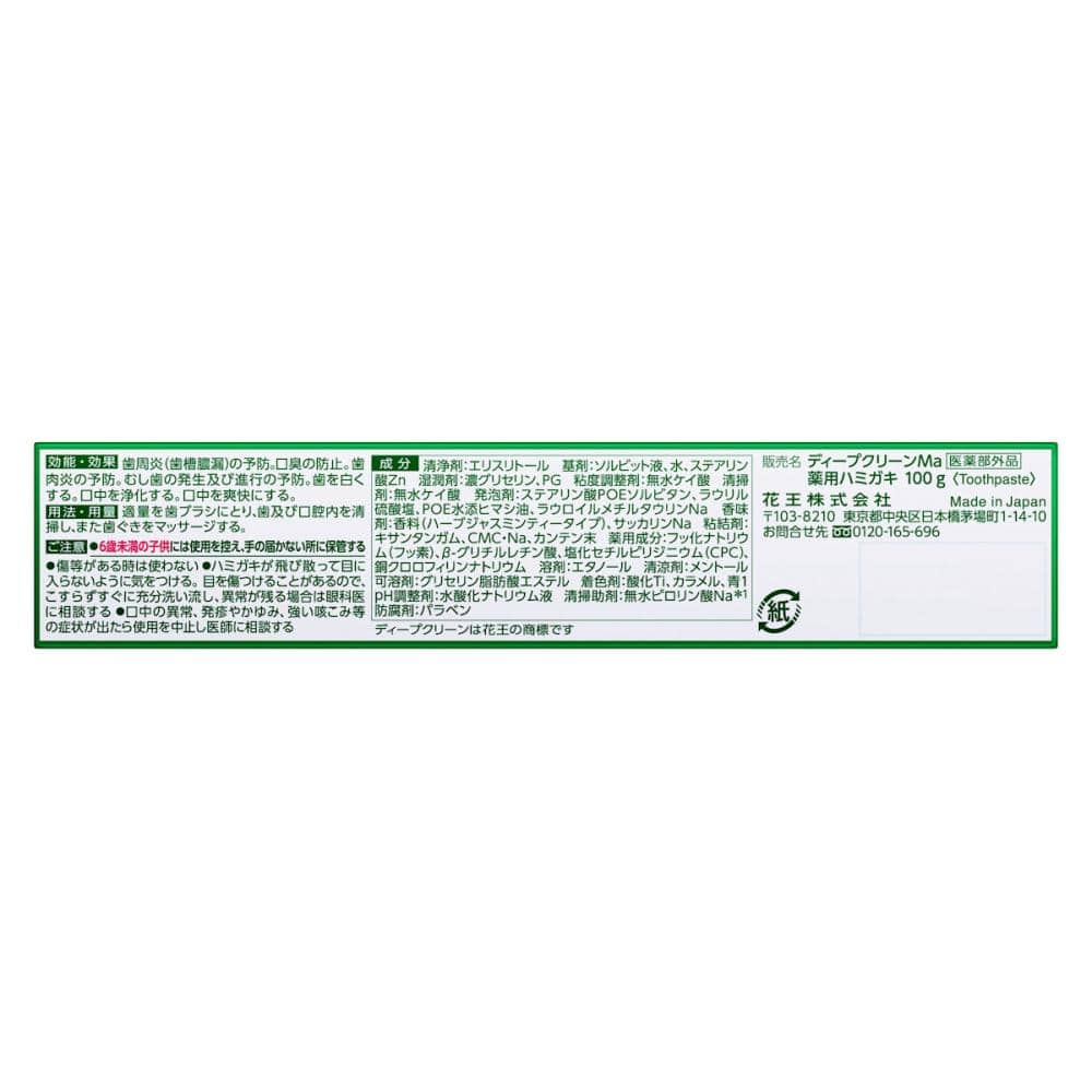 原材料・成分:成分 清浄剤:エリスリトール 基剤:ソルビット液、水、ステアリン酸Zn 湿潤剤:濃グリセリン、PG 粘度調整剤:無水ケイ酸 清掃剤:無水ケイ酸 発泡剤:ステアリン酸POEソルビタン、ラウリル硫酸塩、POE水添ヒマシ油、ラウロイルメチルタウリンNa 香味剤:香料(ハーブジャスミンティータイプ)、サッカリンNa 粘結剤:キサンタンガム、CMC・Na、カンテン末 薬用成分:フッ化ナトリウム(フッ素)、B-グリチルレチン酸、塩化セチルピリジニウム(CPC)、銅クロロフィリンナトリウム 溶剤:エタノール 清涼剤:メントール可溶剤:グリセリン脂肪酸エステル 着色剤:酸化Ti、カラメル、青1pH調整剤:水酸化ナトリウム液 清掃助剤:無水ピロリン酸Na*1防腐剤:パラベン