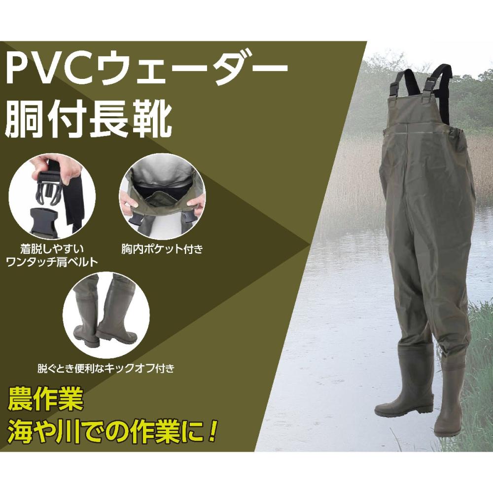 ●着脱しやしいワンタッチ肩ベルト ●脱ぐとき便利なキックオフ付き ●濡れてもいい物を収納できる胸内ポケット ●サイズ 対応身長:174-183胴囲:128脇丈:145股下:92長靴高さ:30.5つま先形状:先丸 ●組成 本体:PVC、長靴: PVC、ベルト:ポリエステル、バックル:ポリアセタール樹脂