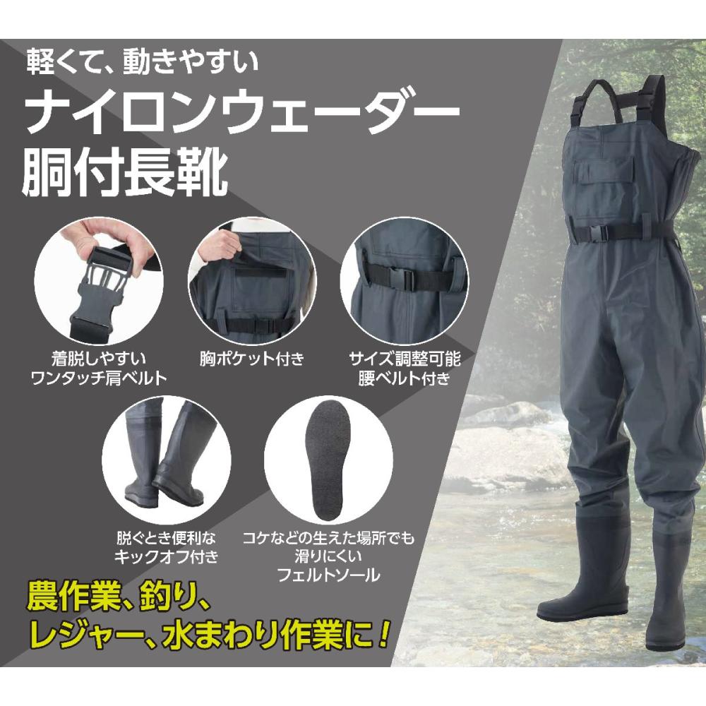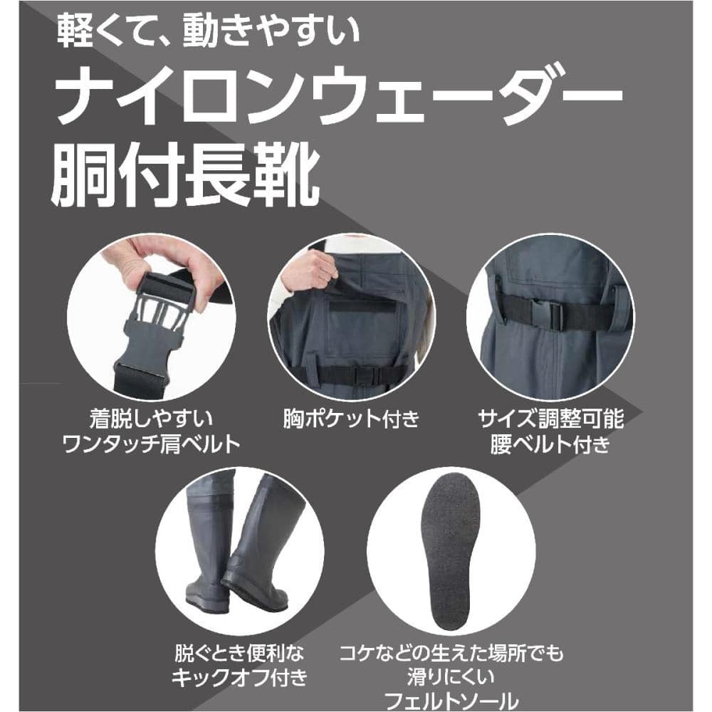●着脱しやしいワンタッチ肩ベルト ●脱ぐとき便利なキックオフ付き ●サイズ調整可能、腰ベルト付 ●万能に使えるフェルトソール ●ウェーダー内に水を入りにくくする 腰ベルト付き ●濡れてもいい物を収納できる 面ファスナー付き胸ポケット ●サイズ 対応身長:171-179胴囲:124脇丈:143股下:90長靴高さ:30.5つま先形状:先丸 ●組成 本体:ナイロン100% (裏面PUコーティング)、長靴: PVC、ソール:フェルト、ベルト:ポリエステル、バックル: ポリアセタール樹脂