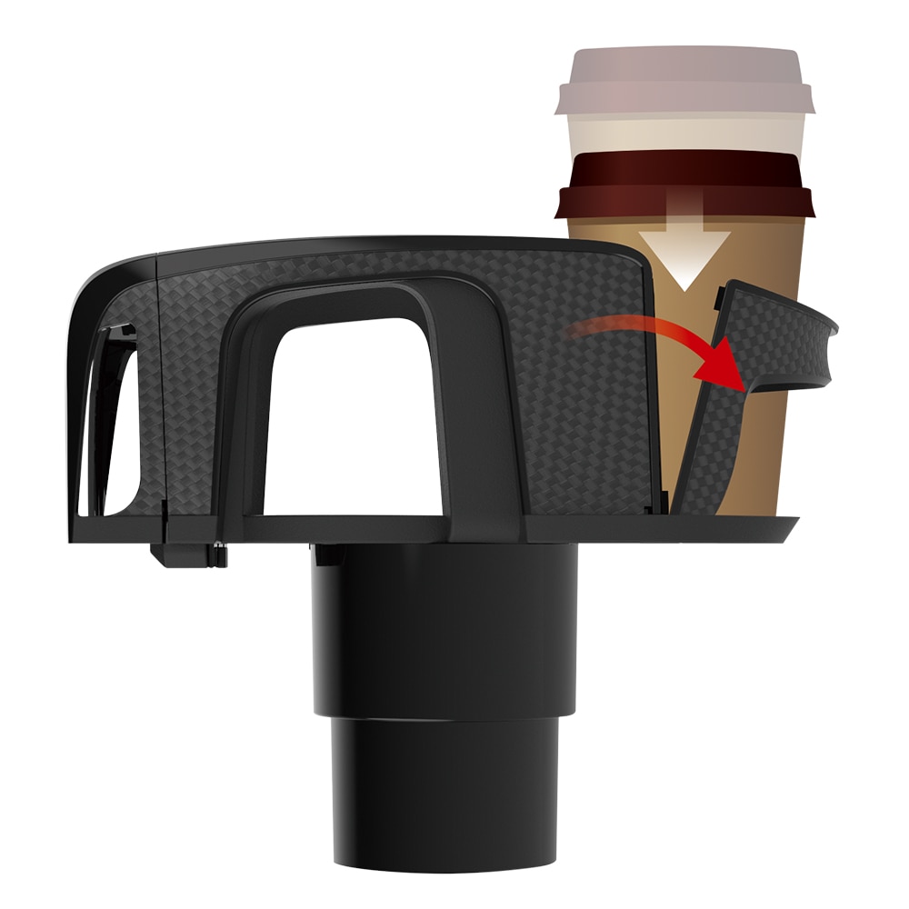 ・ダブルドリンクホルダーとスマートフォンホルダーが一体となったフォルム。 ・純正カップホルダーに挿し込むだけの簡単取付。 ・スマートフォンのスムーズな出し入れができるスムーズスマホアームを採用。 ・取付位置や使い勝手に合わせて、最適な位置へボトルスペーサーの位置を調節して取り付けることができる。 ・スマートフォン収納可能サイズ:幅80mmまで、厚み14mmまで