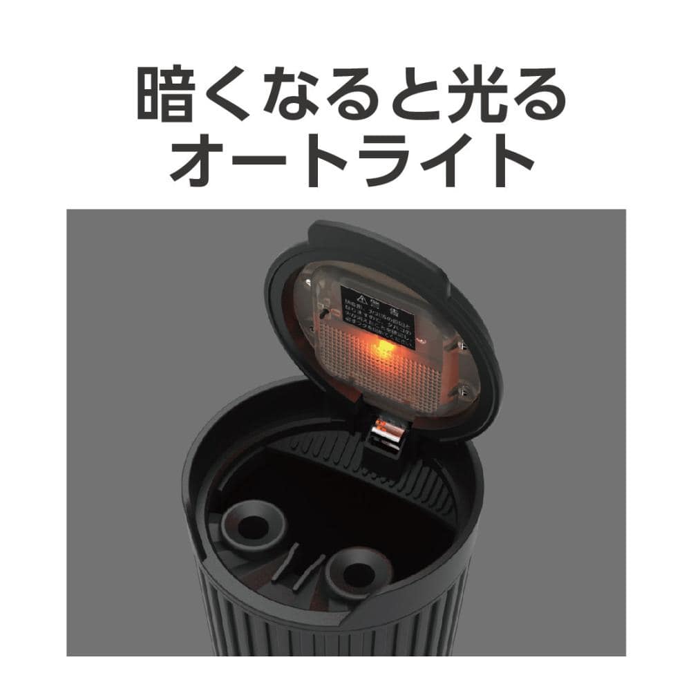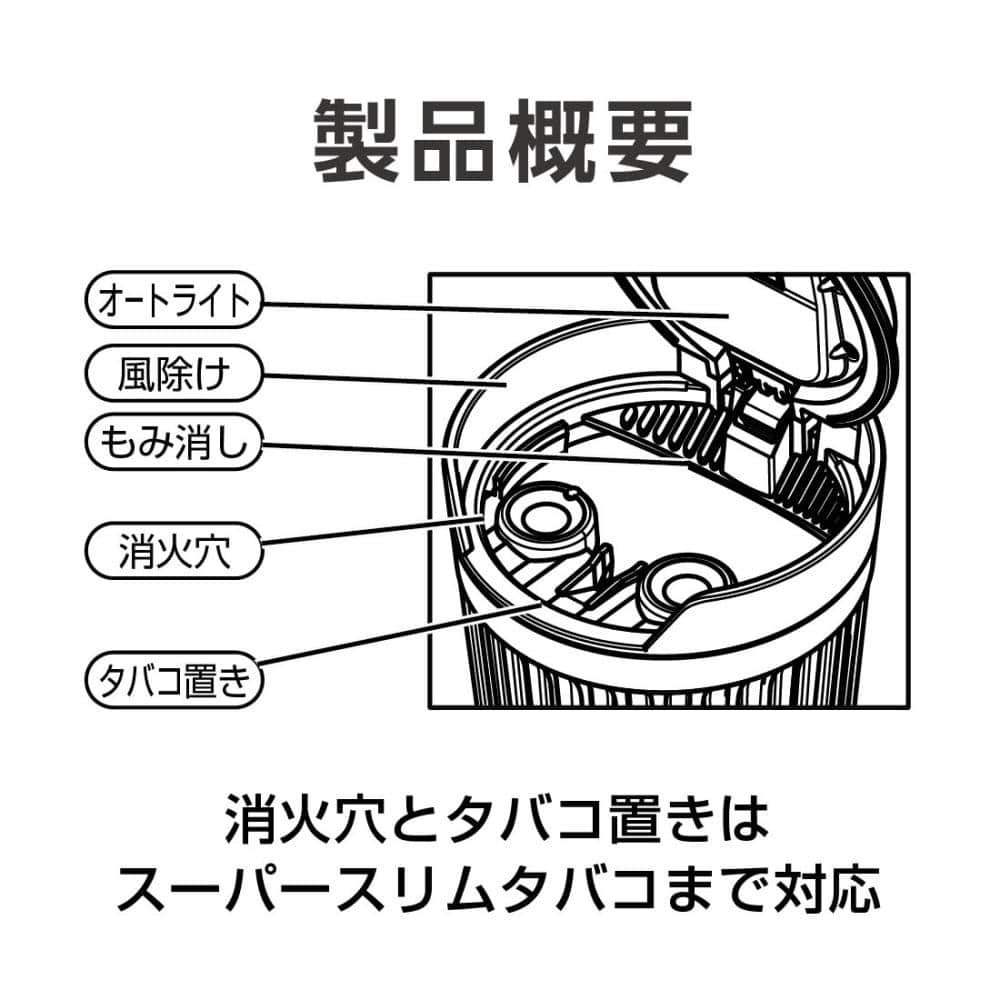 ・ブラックボディに見た目のクールさが引き立つステンシル文字付き ・大きなフタと周囲の壁が灰飛びをしっかりガード ・まぶしくないアンバー(橙色)LEDのオートライト