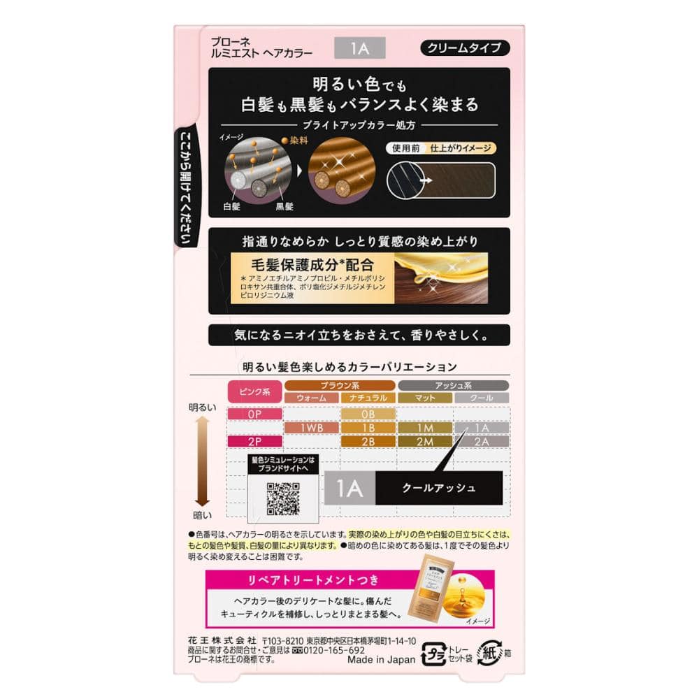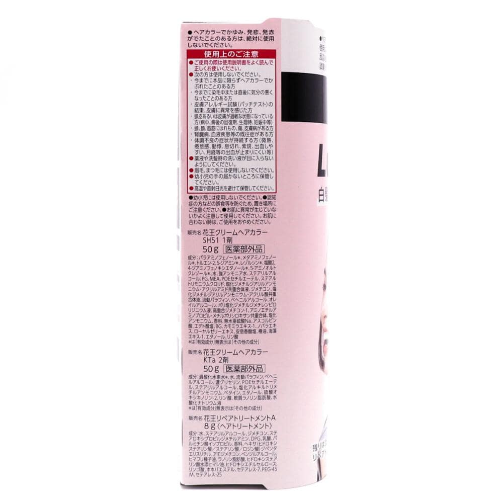原材料・成分:花王クリームヘアカラー SH51 1剤 成分:パラアミノフェノール*、メタアミノフェノール*、トルエン-2,5-ジアミン*、レゾルシン*、塩酸2,4-ジアミノフェノキシエタノール*、5-アミノオルトクレゾール*、水、強アンモニア水、ステアリルアルコール、PG、MEA、POEセチルエーテル、ステアルトリモニウムクロリド、塩化ジメチルジアリルアンモニウム・アクリルアミド共重合体液、ジメチコン、塩化ジメチルジアリルアンモニウム・アクリル酸共重合体液、流動パラフィン、ベヘニルアルコール、オレイルアルコール、ポリ塩化ジメチルジメチレンピロリジニウム液、高重合ジメチコン-1、アミノエチルアミノプロピル・メチルポリシロキサン共重合体、塩化アンモニウム、香料、無水亜硫酸Na、アスコルビン酸、エデト酸塩、BG、カモミラエキス-1、ノバラエキス、ローヤルゼリーエキス、安息香酸塩、椿油、海藻エキス-1、エタノール、リン酸 *は「有効成分」無表示は「その他の成分」 花王クリームヘアカラー KTa 2剤 成分:過酸化水素水*、水、流動パラフィン、ベヘニルアルコール、濃グリセリン、POEセチルエーテル、ステアリルアルコール、塩化アルキルトリメチルアンモニウム、ベタイン、エタノール、硫酸オキシキノリン-2、リン酸、軟質ラノリン脂肪酸、水酸化ナトリウム液 *は「有効成分」無表示は「その他の成分」 花王リペアトリートメントA 成分:水、ステアリルアルコール、ジメチコン、ステアロキシプロピルジメチルアミン、DPG、乳酸、パルミチン酸イソプロピル、香料、ヘキサ(ヒドロキシステアリン酸/ステアリン酸/ロジン酸)ジペンタエリスリチル、アモジメチコン、ベンジルアルコール、ヒマワリ種子油、ラノリン脂肪酸、ヒドロキシステアリン酸水添ヒマシ油、ヒドロキシエチルセルロース、リンゴ酸、ホホバエステル、セテアレス-7、PEG-45M、セテアレス-25