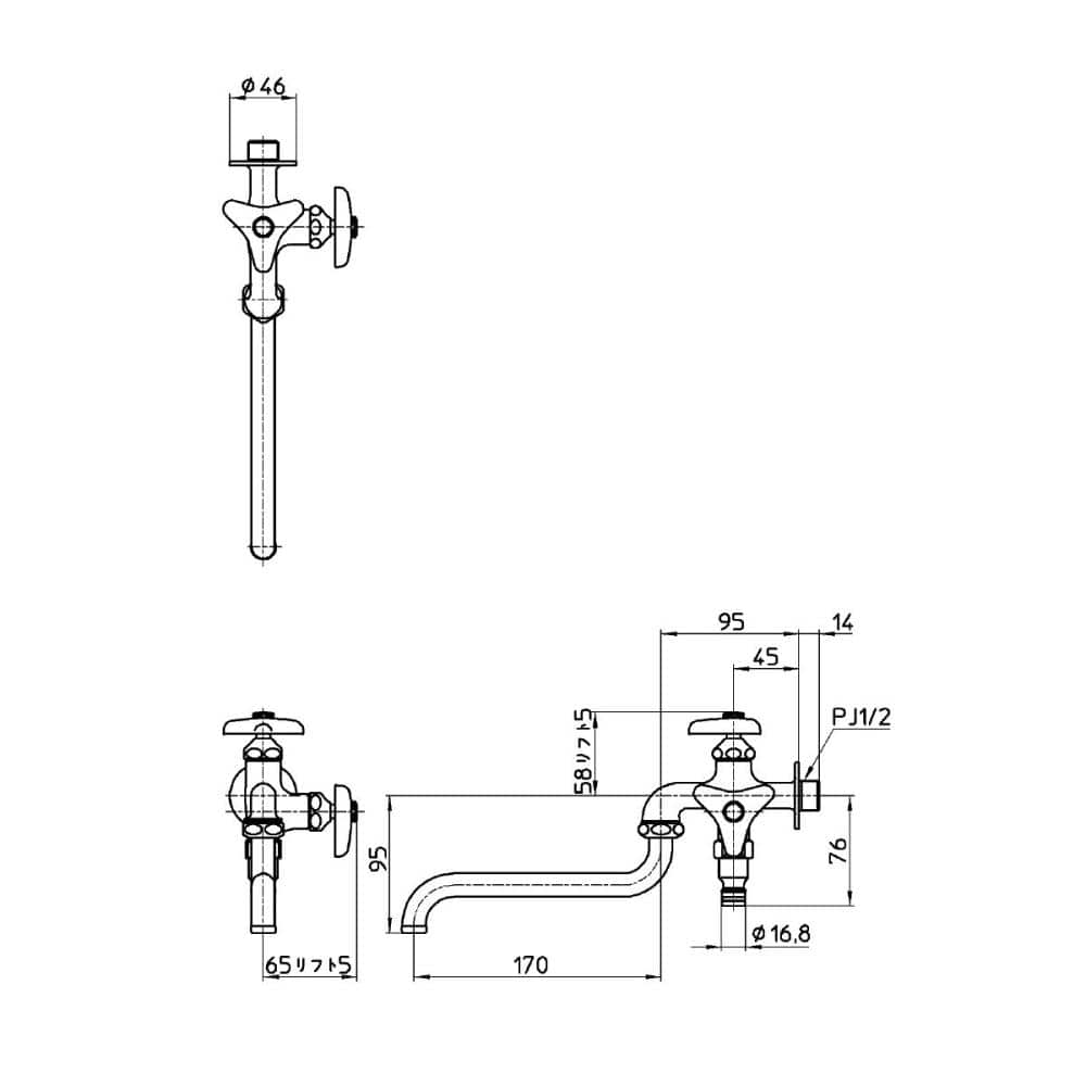 上のハンドルで吐水口部、横のハンドルで ホース接続部に吐水します
