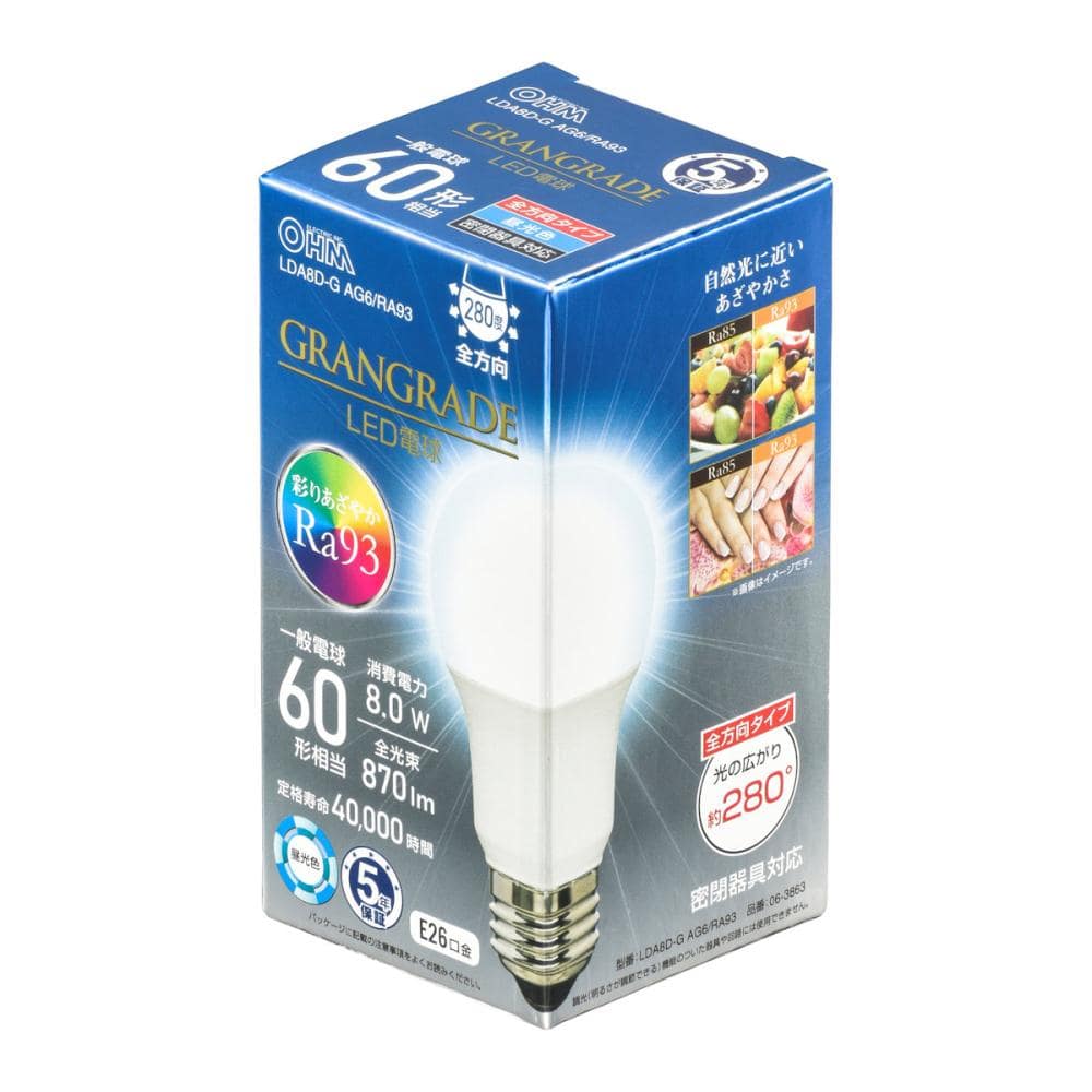 ●自然光に近いあざやかさ ●一般電球40形相当の明るさ ●配光角約280°全方向のタイプ ●密閉器具対応 ●昼光色 ●口金はE26 ●LED5年保証対象商品
