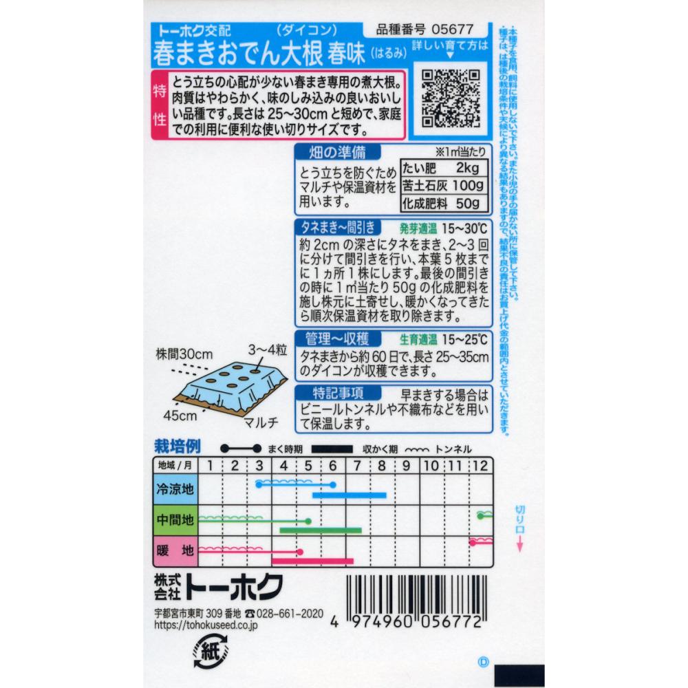 とう立ちの心配が少ない春まき専用の煮大根。肉質はやわらかく、味のしみ込みのよい品種です。長さは25から30センチと短めで、家庭菜園での利用に便利な使いきりサイズです。