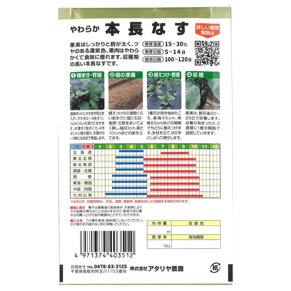 果実はしっかりと胴が太く、ツヤのある濃紫色、果肉はやわらかくて食味に優れます。収穫期の長い本長なすです。