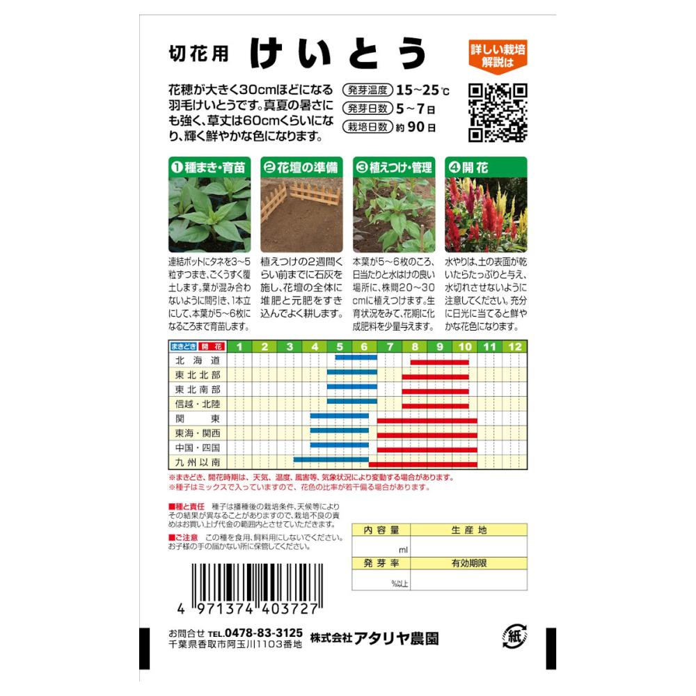 花穂が大きく30cmほどになる羽毛けいとうです。真夏の暑さにも強く、草丈は60cmくらいになり、輝く鮮やかな色になります。