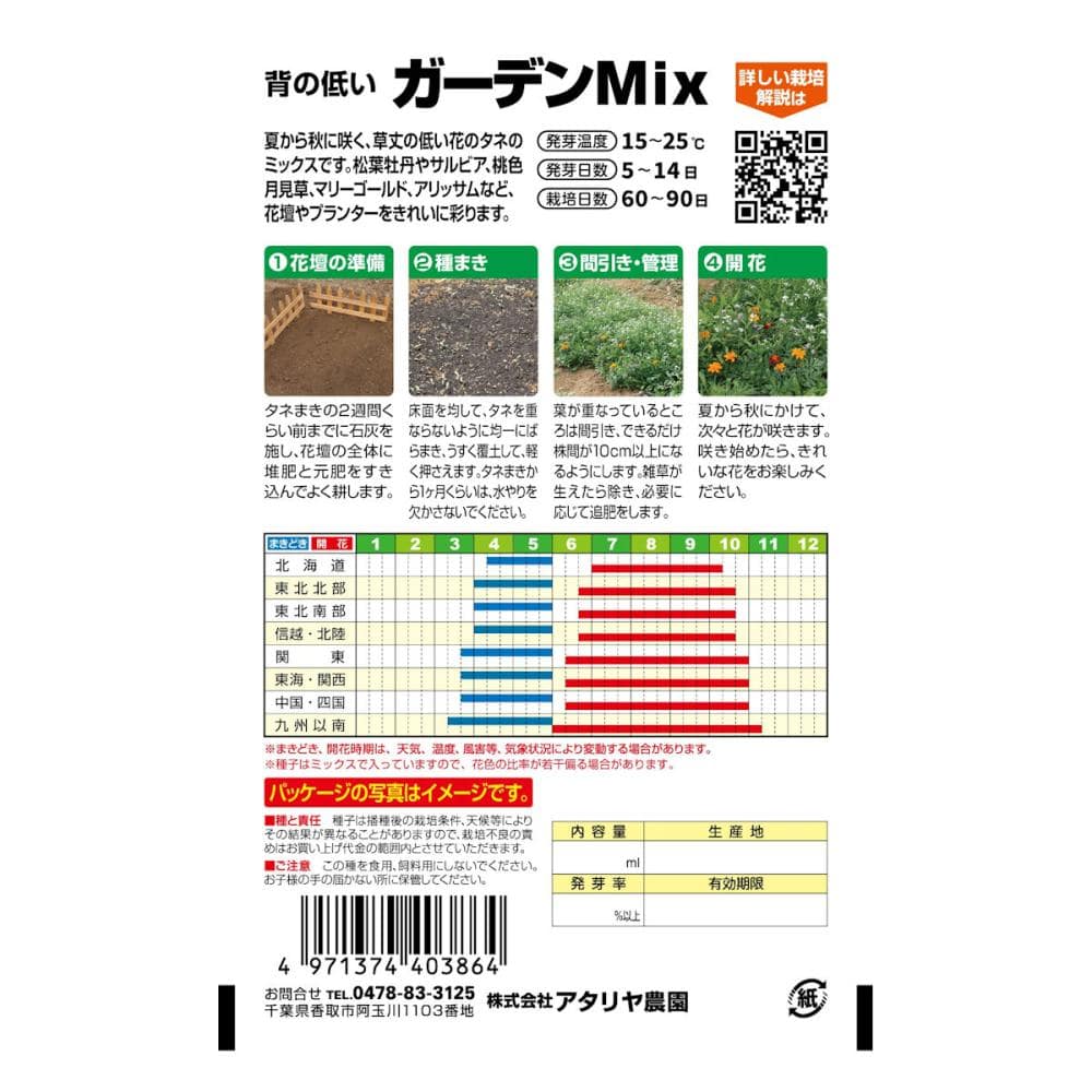 夏から秋に咲く、草丈の低い花のタネのミックスです。松葉ボタンやサルビア、桃色月見草、マリーゴールド、アリッサムなどで、花壇やプランターをきれいに彩ります。