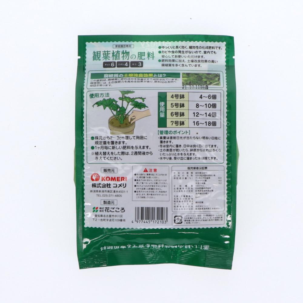 窒素6、リン酸4、カリ3。 ・ゆっくりと長く効く、効性の化成肥料です。 ・カビや虫の発生がないので、室内でも安心してお使いいただけます。 ・肥料効果に加え、土壌改良効果の高い腐植質を多く含んでいます(※) (※)腐植質には、土の保肥力を高める効果があり、肥料切れを防ぐ役目があります。