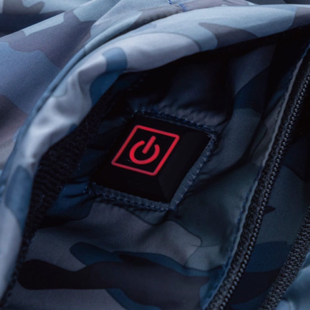 背中上部と腰付近の2箇所に電熱シートを内蔵、バッテリーを使用することで3段階の暖かさを得られます。