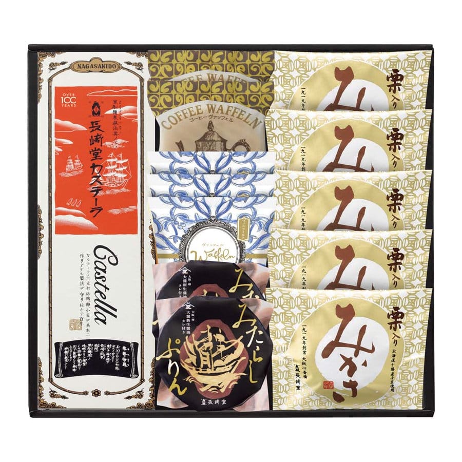 【セット内容】カステーラ(5切入)×2、みたらしぷりん、珈琲ヴァッフェル×各2、ヴァッフェル×3、栗みかさ×5