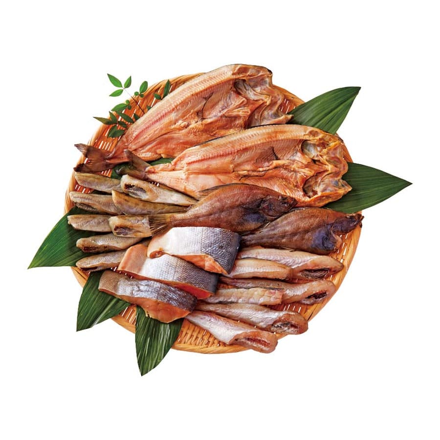 【セット内容】鮭うまみ干し切身80g×3、ほっけ一夜干し200g、宗八カレイ70g×各2、こまい一夜干し、姫たら各300g