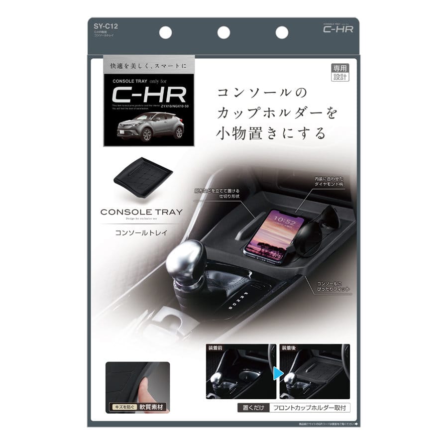 ・C-HR(ZYX10/NGX50)の右ハンドル車専用。 ・専用設計で、内装にピッタリフィット。 ・コンソールのカップホルダーを小物置きにする。 ・シフト前方の純正ドリンクホルダーの上に乗せるだけの簡単装着。 ・ドリンクホルダーをスマートフォンやサングラス等を置くことができるトレイに変えることができる。 ・コンソールの壁を利用して小物を立てかけることができる仕切り付き。 ・コンソール側も置いた物もカタつかず、傷が付きにくい軟質素材。