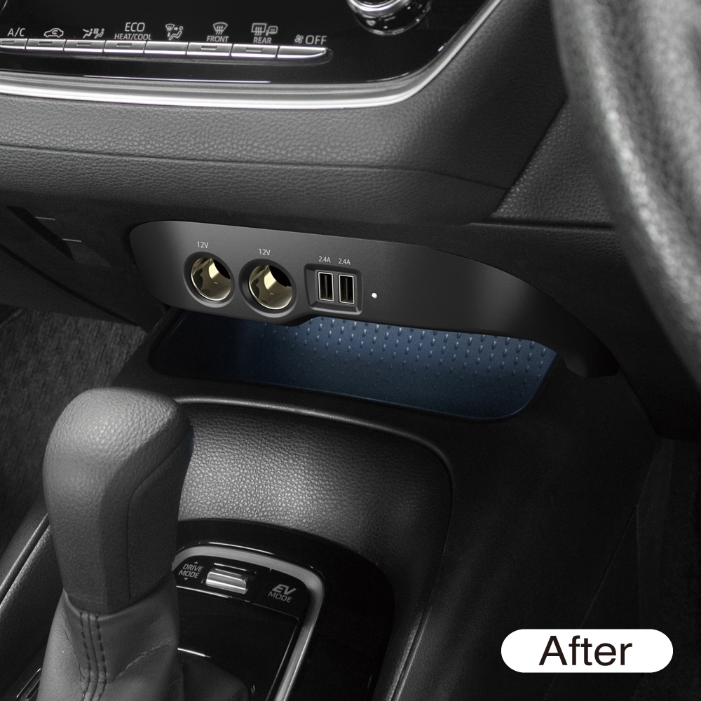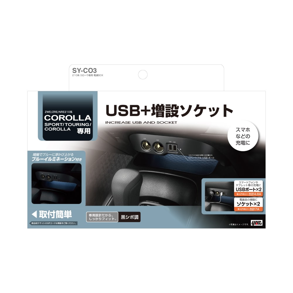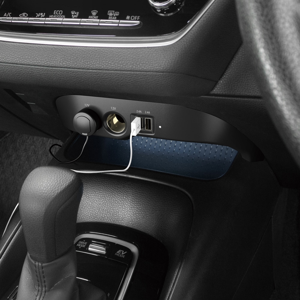 ・カローラスポーツ/カローラツーリング/カローラ(ZWE/ZRE/NRE210系)の右ハンドル車専用のフロントコンソールトレイに取り付ける増設ソケット。 ・専用設計で、内装にピッタリフィット。 ・USBポートはどちらの向きでも挿せるリバーシブルタイプ。 ・通電するとフロントコンソールをイルミネーションランプでブルーに照らす。 ・両面テープで簡単取付。